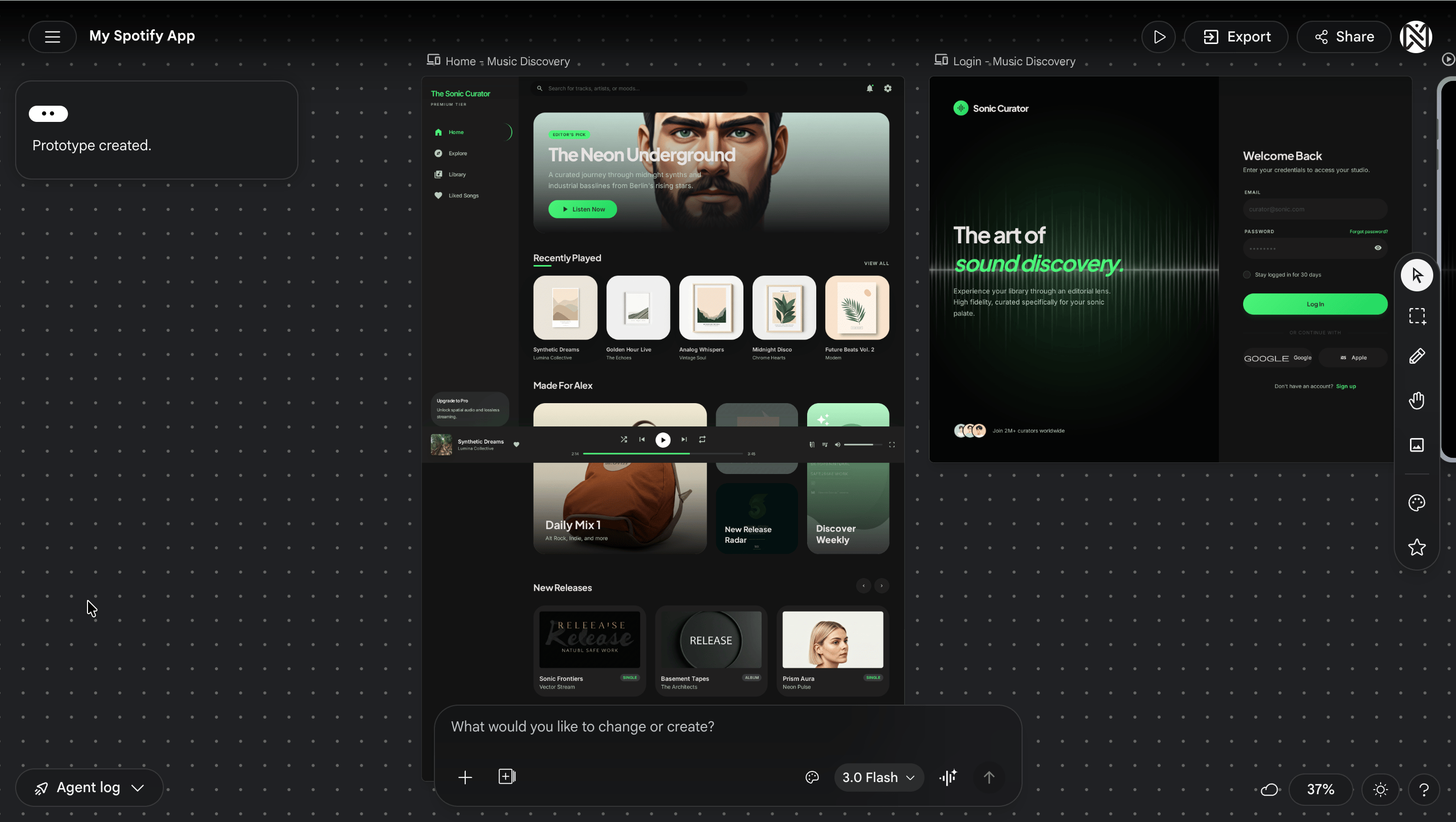 What I fed into Stitch: Spotify's homepage URL. My prompt asked it to extract the full design system, create a design.md, and then design an original web dashboard carrying the same vibe.