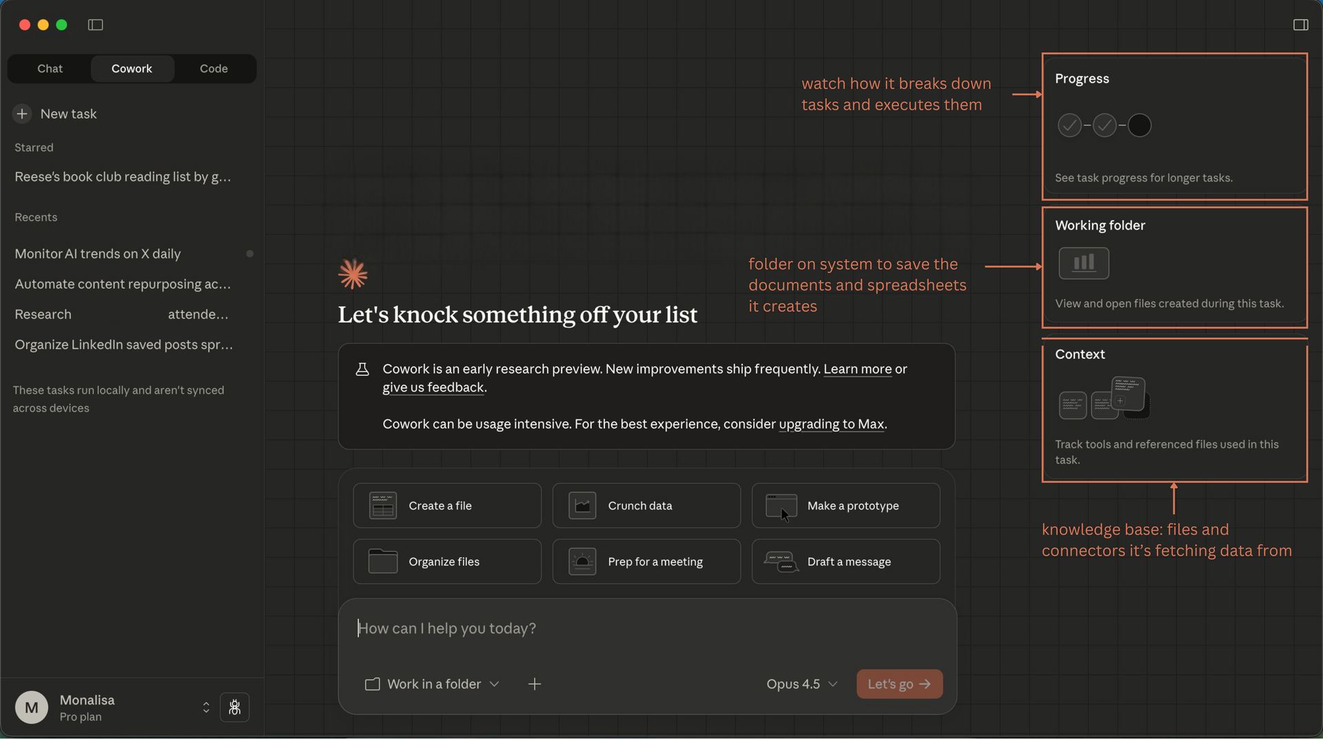 It actually works: For file‑based knowledge work, Cowork delivers on the promise. Multi‑step research, synthesis, and document generation tasks that would take hours happen while you're in meetings.
